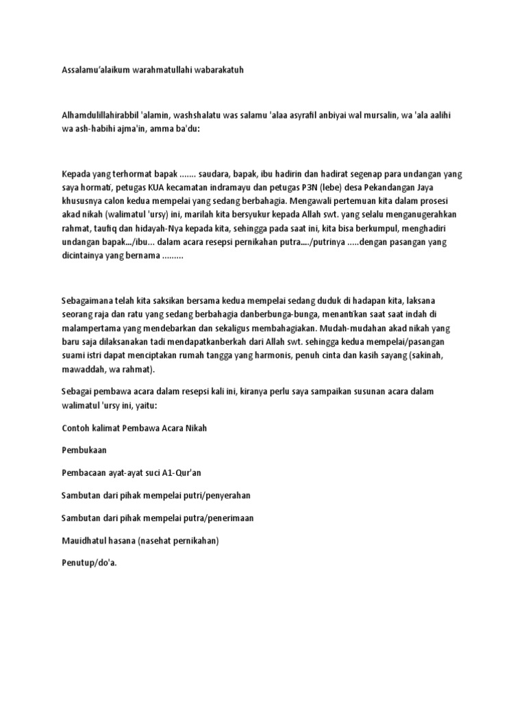 Susunan acara pernikahan islami tersebut berfungsi untuk mengatur jalannya prosesi acara pernikahan islami dari awal sampai akhir. Berikut contoh dari susunan acara resepsi pernikahan, contoh dibawah ini tidak baku, kamu bisa merubahnya sesuai yang diinginkan. Acara pembubaran panitia ini di awali dengan pemaparan laporan pertanggung jawaban oleh ketua panitia pelaksana. Belajar mc contoh naskah mc nikah penutupan youtube. Dimulai dari awal persiapan hingga dimana hari h pernikahan tiba, tentunya semuanya itu dilakukan dengan secara matang dan penuh dengan perhitungan. Susunan panitia akan dibuat mulai dari ketua pelaksana, pembagian tugas penerima tamu (among tamu), pasrah atau terima pengantin, juru masak. Dalam mempersiapkan acara pernikahan putra/putrinya, biasanya akan dibentuk panitia pelaksanaan hajatan pernikahan terlebih dahulu. Yakni merupakan sebuah susunan dari suatu program dengan secara sistematis dari dilangsungkannya sebuah acara yang dibatasi. 11.10 tarian penyambutan pengantin : Hiburan barangkali sudah menjadi acara wajib dalam resepsi pernikahan, tujuannya tentu saja untuk menghibur para tamu. Kata sambutan bahasa jawa singkat berita terbaru hari ini. Contoh pidato sambutan tuan rumah pembentukan panitia pernikahan. Sambutan resepsi perkawinan nasrulchair s blog.